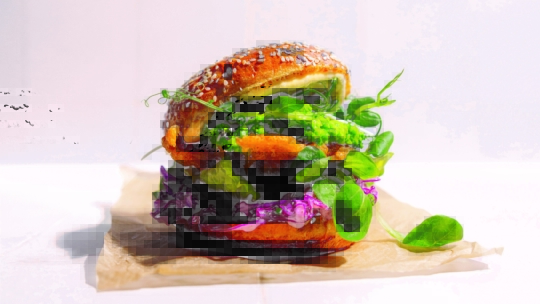 mit rotem Coleslaw und Erbsen-Guacamole im Brioche-Bun