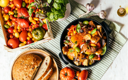 Die bunte Paradeisermischung nach Belieben in Stücke schneiden. Die knusprigen Croûtons mit den Paradeisern, Zwiebeln und fein geschnittenem Basilikum vermischen,