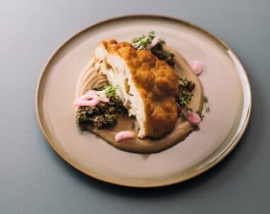 Zum Anrichten Karfiolpüree auf den Tellern verteilen und glattstreichen. Mit je einem halben Karfiol und einem Viertel der Quinoa toppen und mit eingelegten Zwiebeln garnieren.