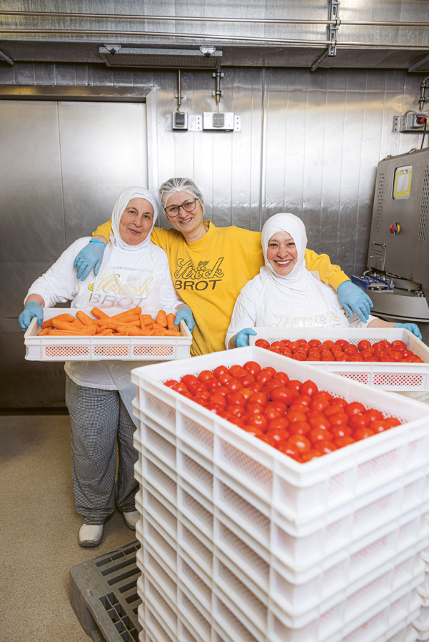 Eine besondere Verantwortung trägt auch unser Weckerl-Aufschneider, ein eigener Job, der nicht für alle Sorten mit der Maschine erledigt werden kann – viele der Weckerl werden schließlich nicht ganz durch, sondern nur perfekt angeschnitten, damit die Füllung ja nicht rausfällt. Auch beim Belegen geht es nicht ohne Handarbeit: jedes einzelne Weckerl, Brot und jede Salatschüssel bekommt seine oder ihre Aufmerksamkeit.