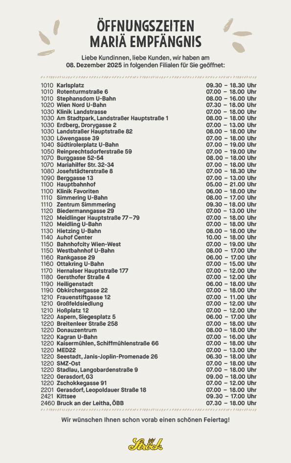Hier finden Sie alle Filialen, die auch an Mariä Empfängnis, für Sie geöffnet haben.