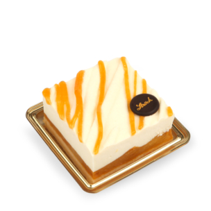 Biskuitboden mit Mango-Gelée, Mango-Stücken und Topfencreme, verziert mit weißer Sprühschokolade und Marillenmarmelade