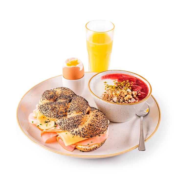 Weiches Bio-Ei, Bio-Mohnstriezerl mit Bio-Butter, Schnittlauch, Bio-Beinschinken & Bio-Gouda, Joghurt mit Erbeerkompott & Granola, dazu 1/8l frisch gepresster Orangensaft